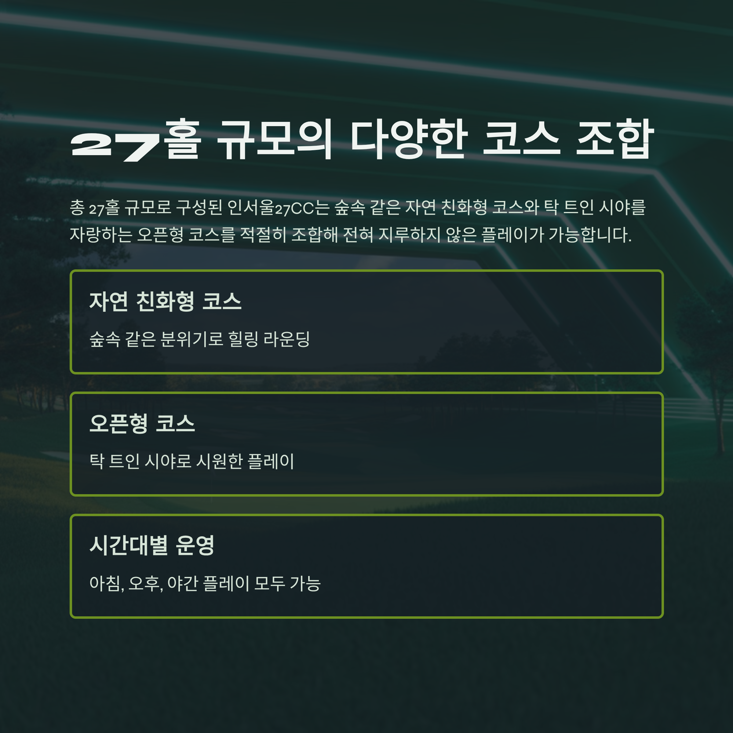 서울과 가까운 위치에서 쾌적한 라운딩을 즐기고 싶은 골퍼들에게 꾸준히 사랑받고 있는 곳, 바로 인서울27CC입니다. 도심에서 멀지 않아 접근성이 뛰어나고, 다양한 코스 구성으로 초보자부터 숙련자까지 모두 만족할 수 있는 골프장이에요. 이번 글에서는 인서울27CC의 위치, 코스 특징, 시설, 예약 팁까지 한눈에 정리해드립니다.